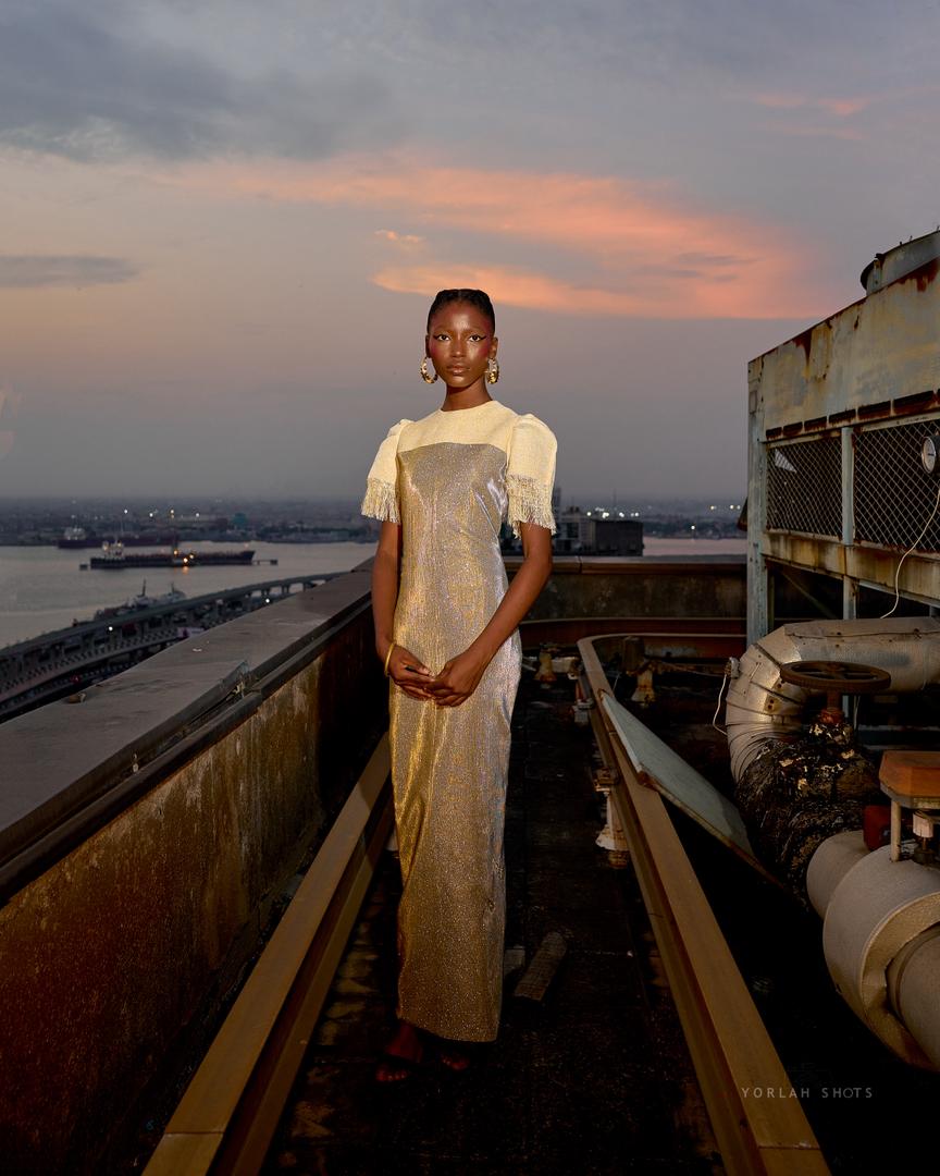 The Olori Dress is a blend of refined elegance and artisanal craftsmanship. Handwoven Aso Oke is paired with a richly textured, crystal-effect fabric, creating a luminous depth that captivates at every angle.